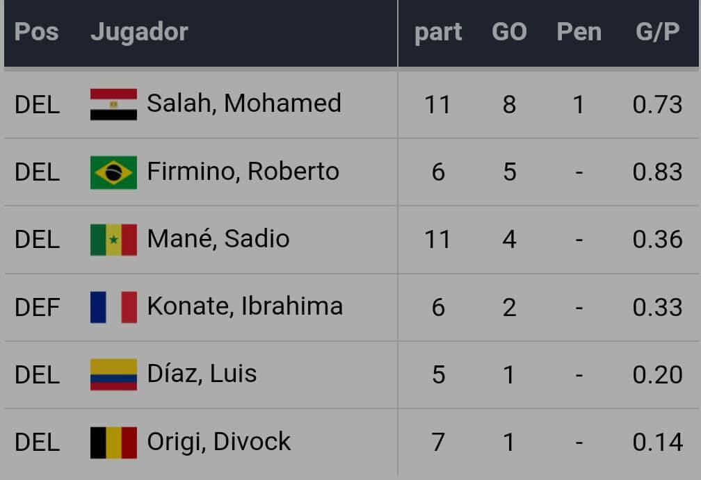 - O Mohamed é o melhor marcador do Liverpool com uma média de 0,73 gols por jogo.