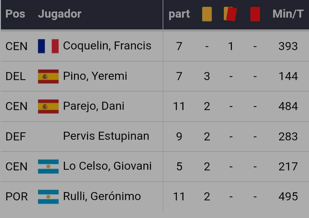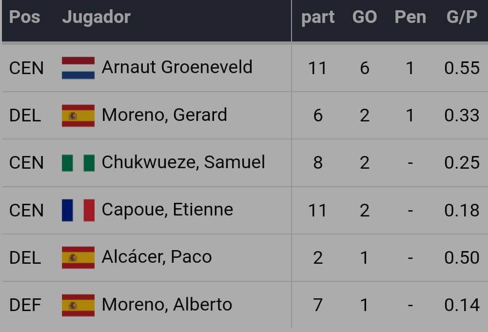 - O maior assistente é o Gerard com um total de 4 assistências em 6 jogos disputados.
