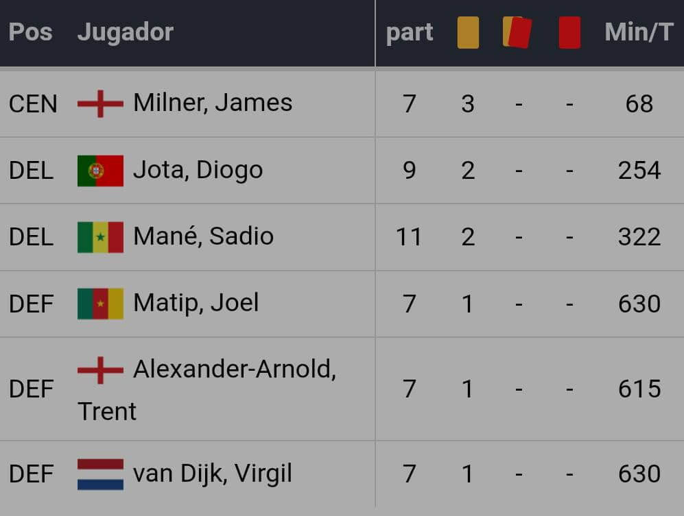 - O Tsimikas é o segundo como assistente, sendo defesa, deu 2 assistências em 4 vezes disputadas.