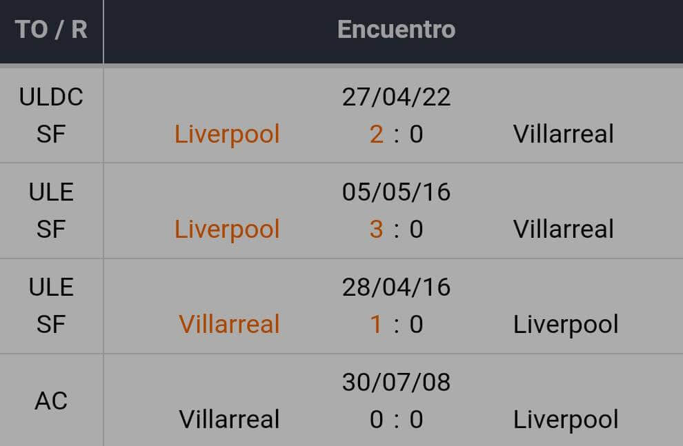 - Nos últimos 4 jogos disputados, 2 foram vencidos pelo Liverpool, 1 pelo Villareal e um empatado em 2008.