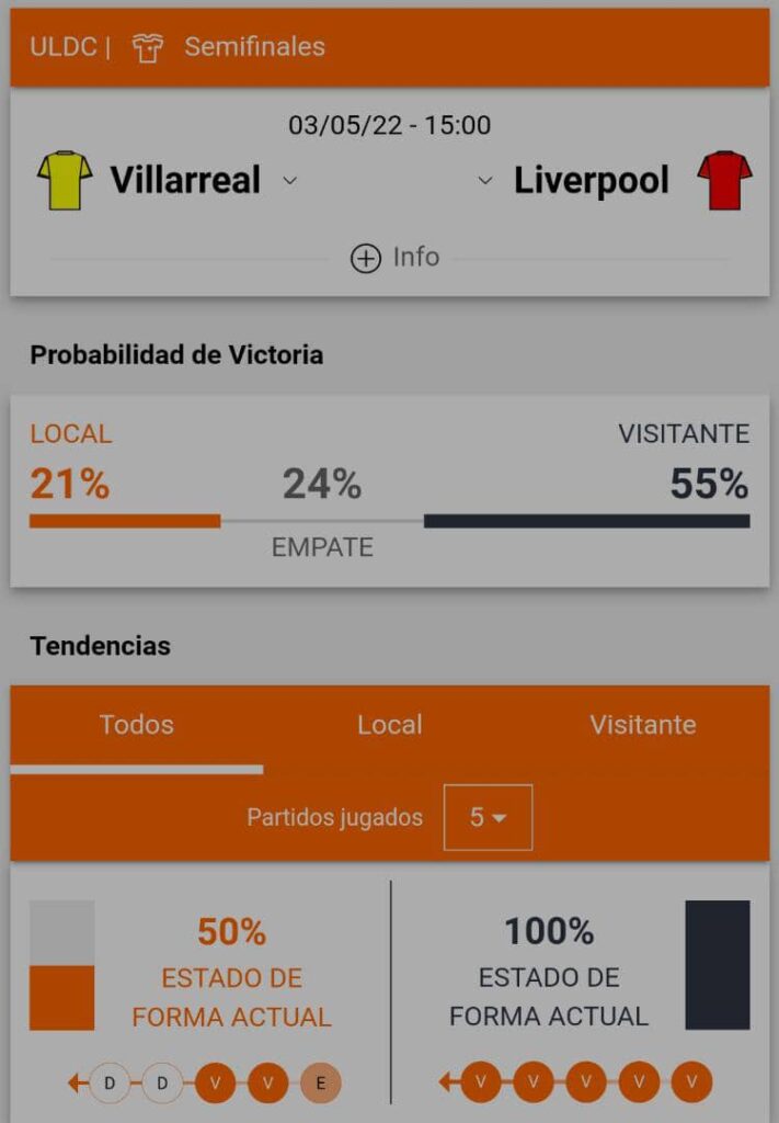De acordo com as estatísticas apresentadas entre as melhores casas de apostas, há 21% de chance de o Villareal ser o vencedor, enquanto o Liverpool tem 55% de chance de vitória. Apenas 24% é considerado para empate. No entanto, essas estatísticas, juntamente com as tendências de forma da equipe, sugerem apostar em um placar de 2 a 1 a favor do Liverpool.