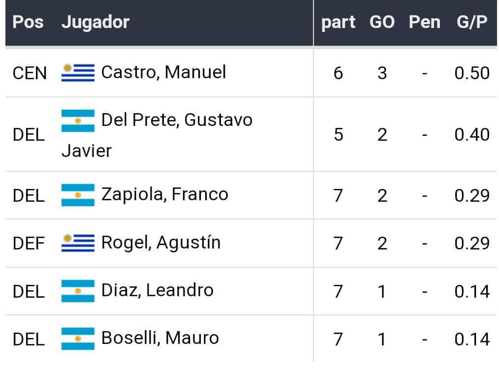 - O artilheiro do jogo é Diaz, Defensor, com uma média de 0,43 assistências por jogo.