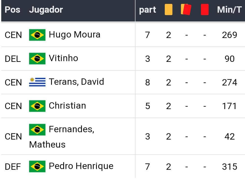 - Os cartões, todos têm pelo menos 2 cartões amarelos, mas Hugo Moura lidera em termos da quantidade de minutos que lhe foram dados.