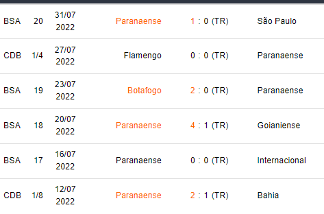 De acordo com a tabela de jogos da LeoVegas Apostas, os últimos 5 jogos do Paranaense: 1 vitórias, 2 empates e 2 derrota. Abaixo está a visão geral de cada partida com suas estatísticas.