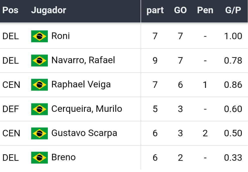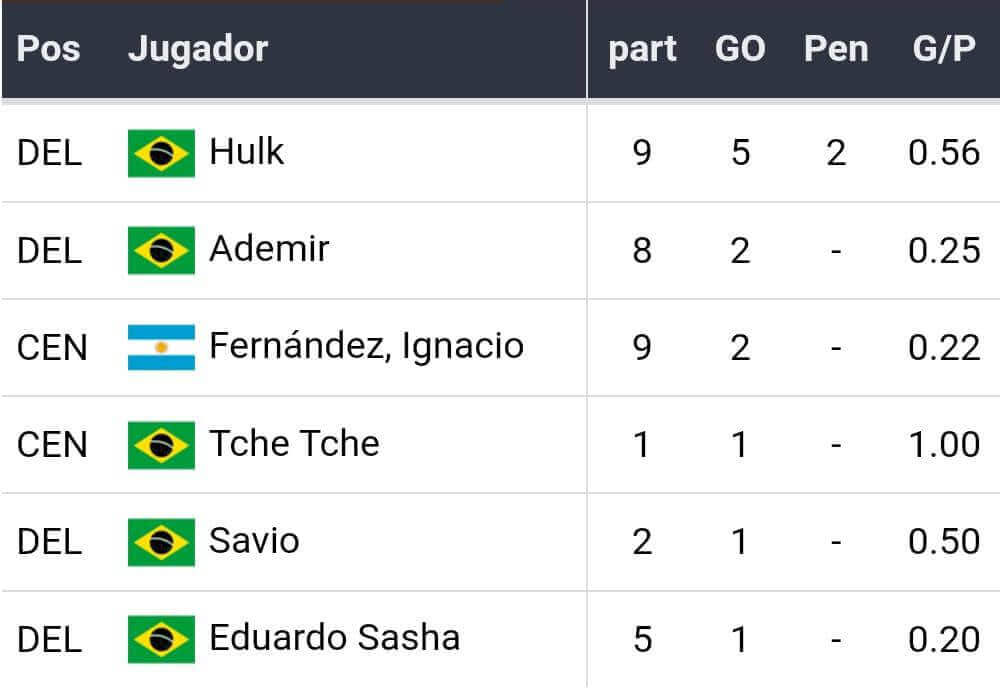 · Metas: Hulk 45+1′, Murilo Cerqueira 47′ –GEC- (ATM); murillo Cerqueira 59′, Danilo Dos Santos 90+2′ (PAL)