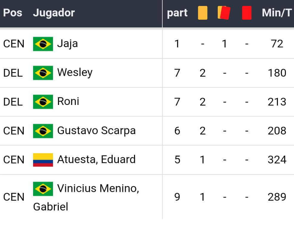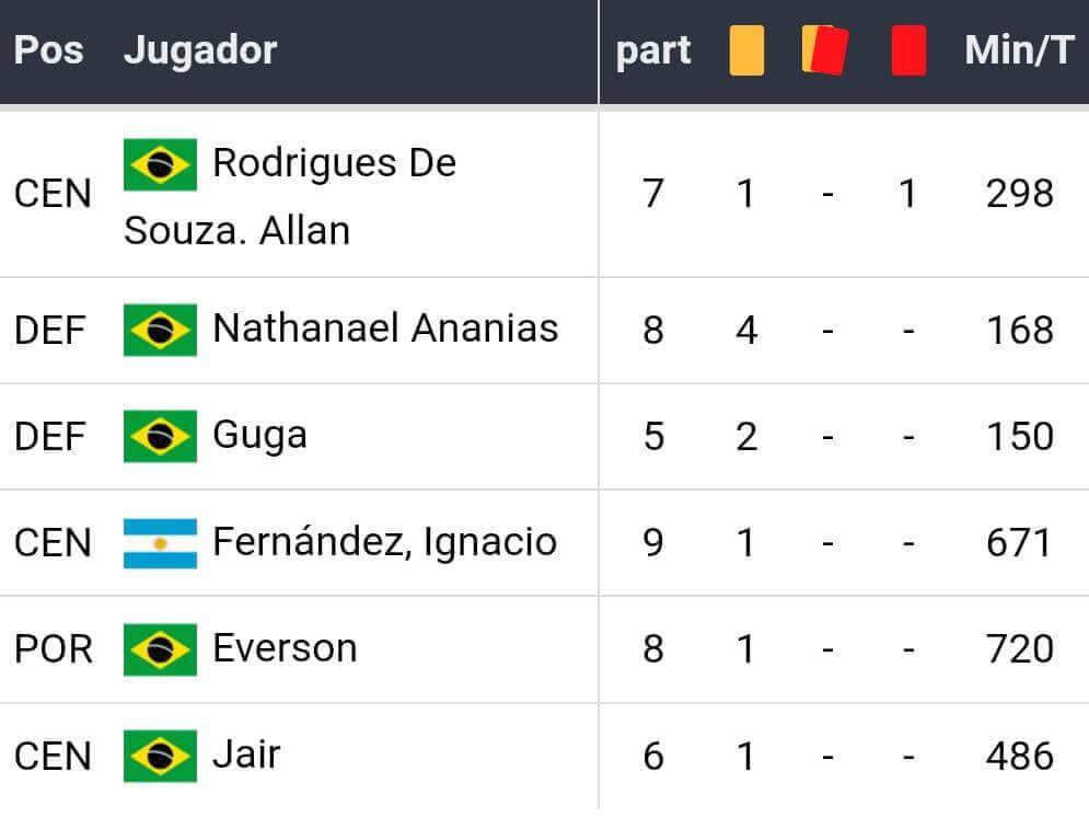 o Cartões amarelos: 0