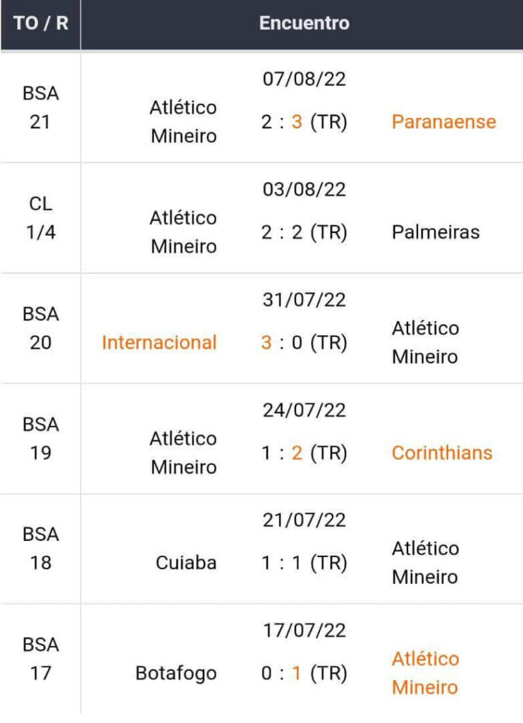Últimos 5 jogos do Atlético Mineiro
