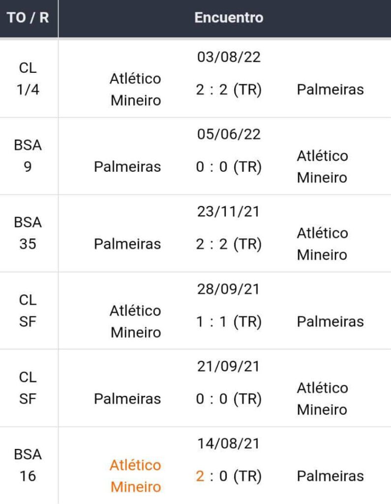 · Ao longo da história, essas equipes se enfrentaram 50 vezes. O Palmeiras domina a história com 20 vitórias contra 15 vencedores do Atlético Mineiro. Por sua vez, eles também empataram 15 vezes.