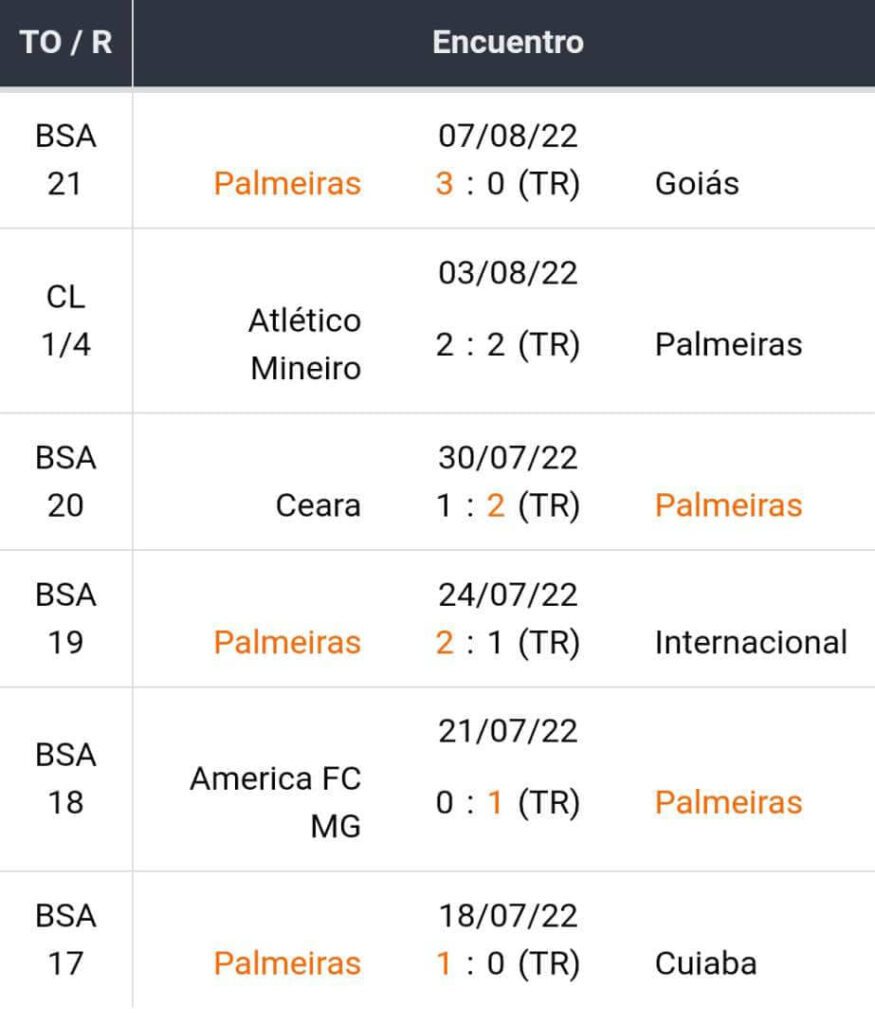 Últimos 5 jogos do Palmeiras